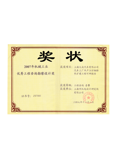 2007年机械工业优秀工程咨询勘查设计壹等奖